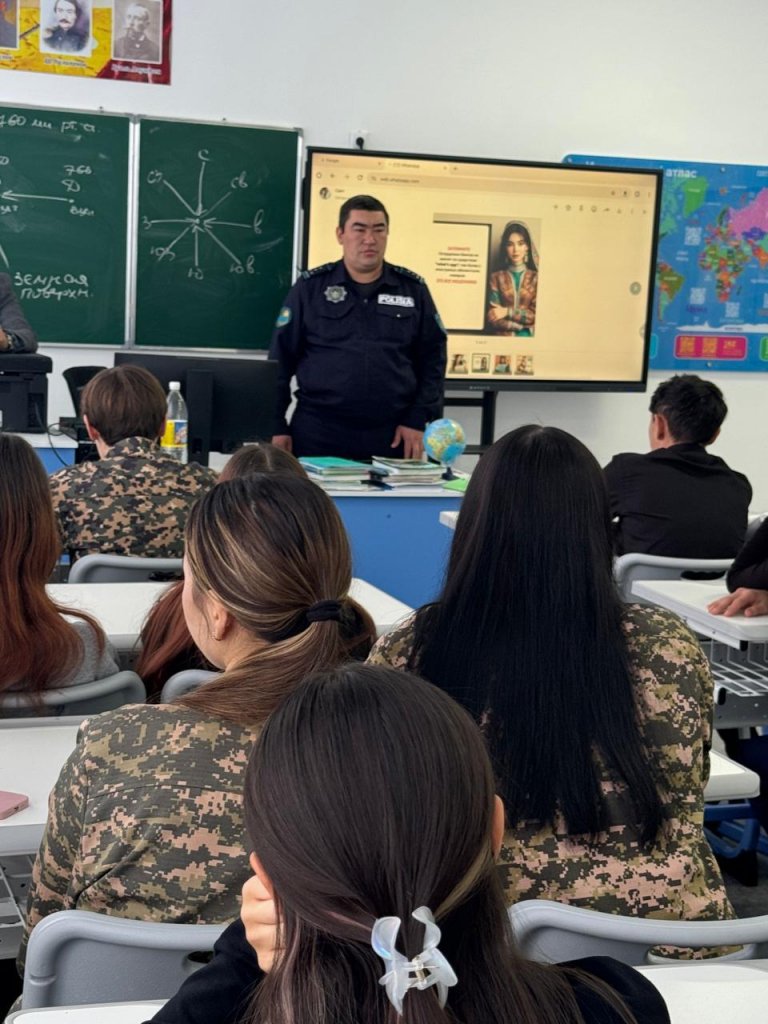 2025 жылғы 6 қарашада «Өркен ауылының ББМ» КММ-де полиция капитаны С.М. Нүкенов 7-11 сынып оқушыларымен «Дропқа айналма» тақырыбында дәріс өткізді. Әңгімелесудің мақсаты: Жасөспірімдердің құқықтық сауаттылығын қалыптастыру және дроп-аккаунттарға және өздерінің банктік деректерін үшінші тұлғаларға беруге байланысты қаржылық схемаларға қатысқаны үшін жауапкершілікті түсіну.